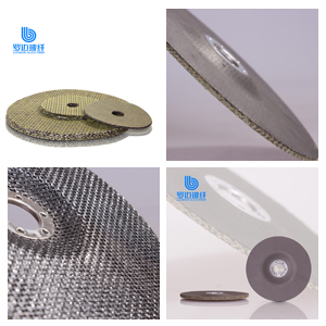 • “羅邊玻璃纖維增強砂輪網片 是采用玻璃纖維增強網布涂以酚醛、環氧改性樹脂,經烘培后沖切而成,裁切采用外徑、內孔一次沖切成形工藝。因此,網片具有尺寸公差小,同心度好,周邊光潔等優點。該產品主要為不織布復合網片、黒紙復合網片和純網片,具有極好的耐熱性、高速切割性能及高結構強度。“